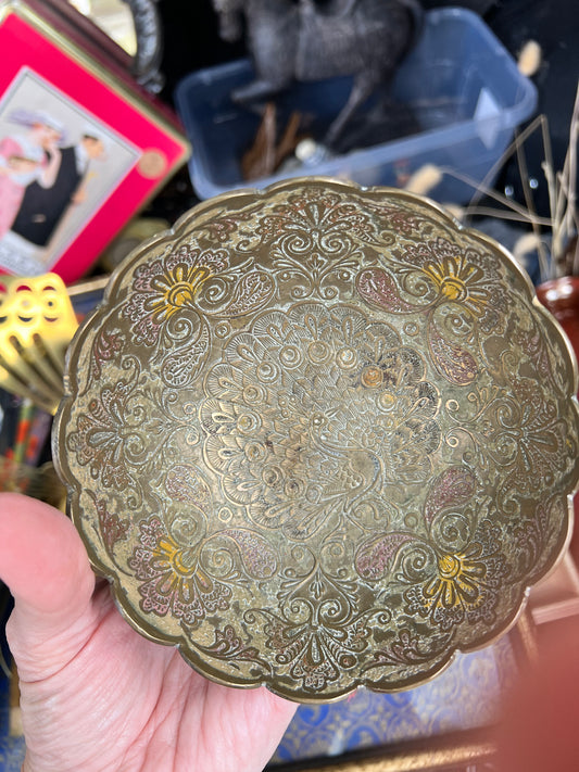 Pedestal brass dish with Peacock in center & beautiful color around the outside