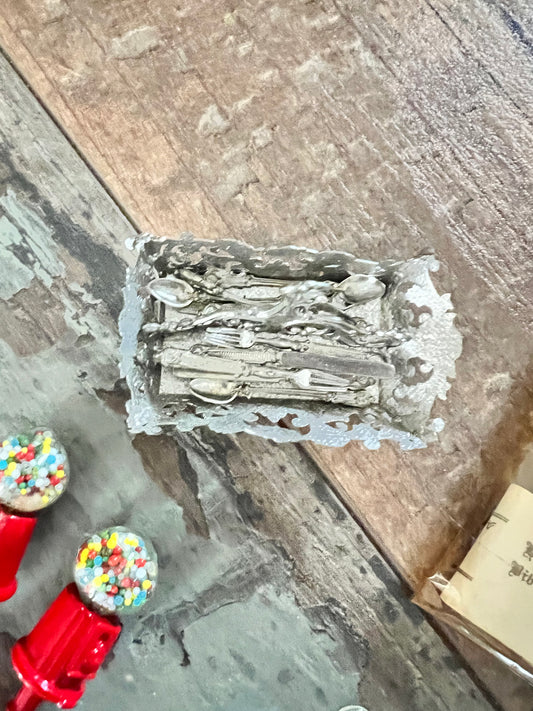 Miniatures, Doll house accessories, bubble gum machine, silverware, glassware, croquet set, Bibles